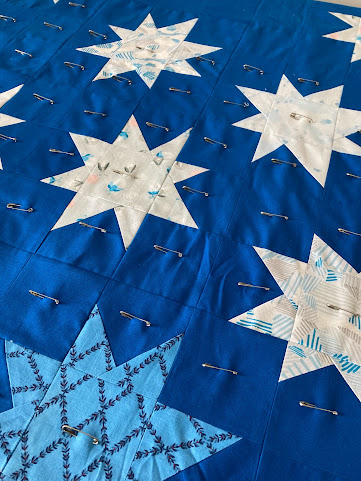 I don't have any pictures prior to the pin basting, but this is how it looked at that point. I chose not to make quite as many stars as Elizabeth did, but I do love the way the wonkiness makes them appear to twinkle a little bit. For the background I used Kona Pacific. I didn't want too dark of a color blue, and this one was just what was needed. I had some fabrics in my stash and bought some more to make the stars.
